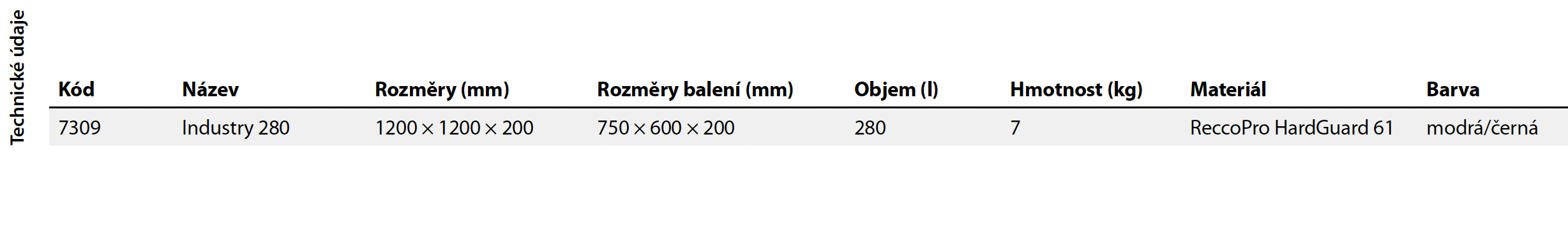 Záchytná vana INDUSTRY je vyrobena z odolného recyklovatelného ReccoPro HardGuard materiálu s vysokou mechanickou a chemickou odolností. Záchytná vana je dodávána s demontovanými bočními vzpěrami, což minimalizuje velikost balení v době, kdy se vana nepoužívá a umožňuje pohodlnější a méně fyzicky náročnou manipulaci. Dodatečná instalace bočních vzpěr je velmi rychlá, hladká a bez použití nářadí. Smart-Up Lock systém bočních vzpěr zajišťuje bleskové postavení boků do vzpřímené 90° pozice a stejně rychlé sklopení do vodorovné pozice, což umožňuje pohodlný vjezd, výjezd a manipulaci uvnitř vany. Vzpěry zamezují prověšení boků a jsou opatřeny otvory pro ukotvení k zemi při silném větru. Vzpěry se sklápí pouze jedním směrem, a to dovnitř do vany. Speciální systém uzamčení rohů vany Leak Proof Seal šrouby s těsněním zabraňuje protečení i při maximálním naplnění vany tekutinou. Teplotní rozsah použití záchytné vany je –30 °C až +70 °C.