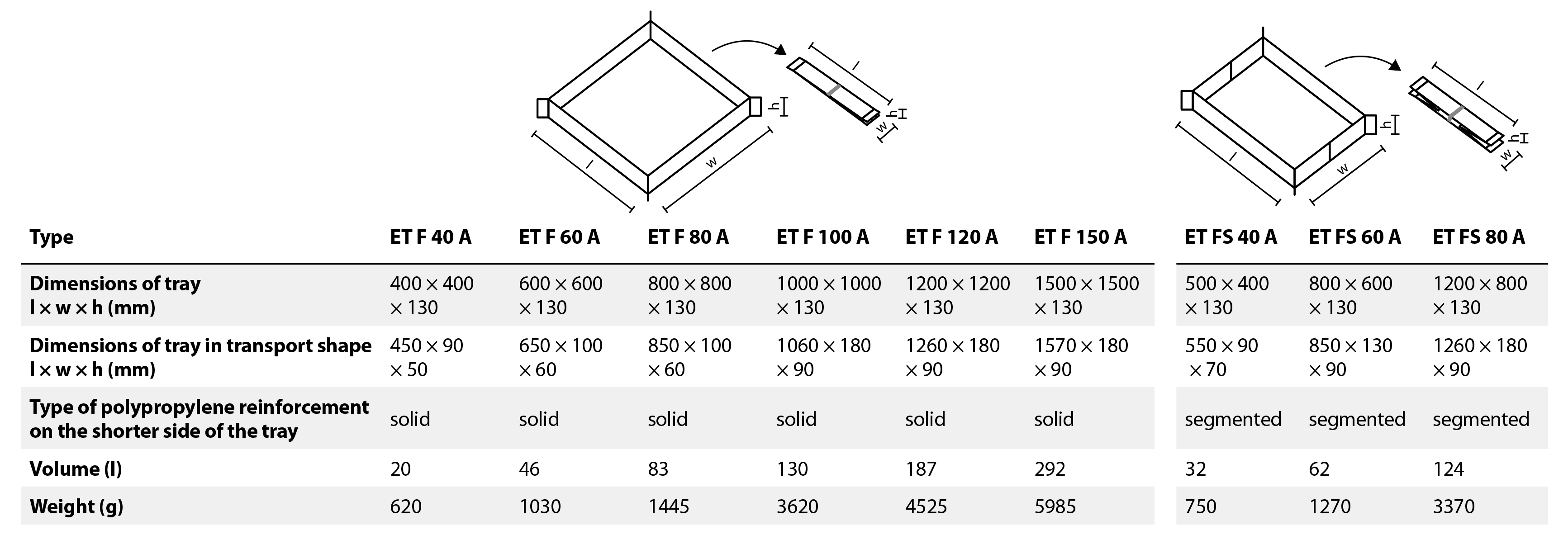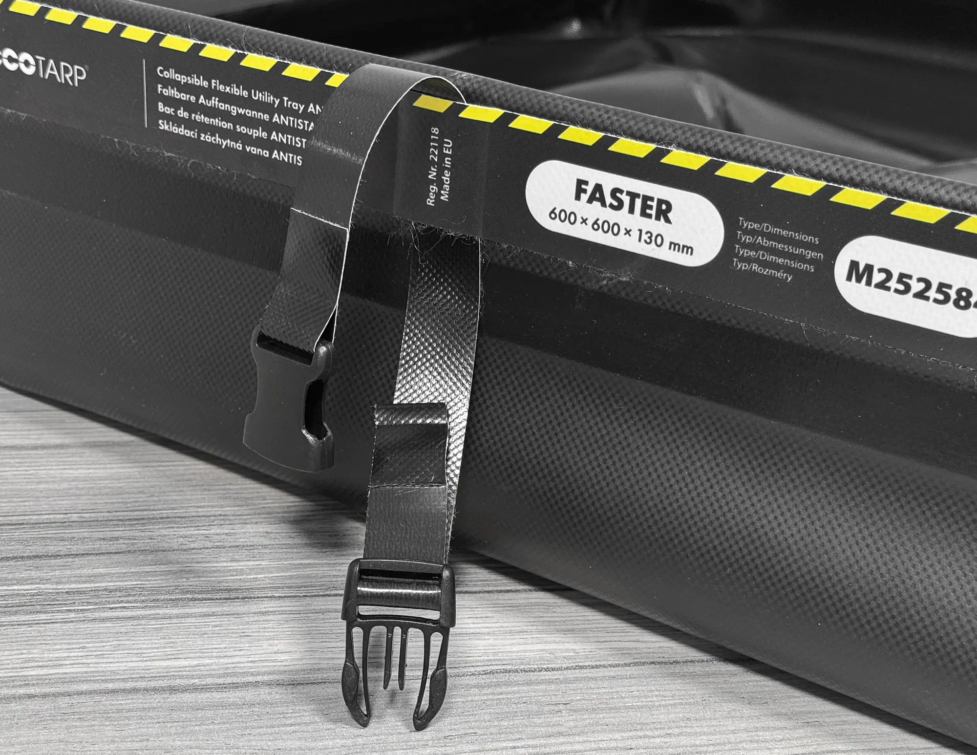 The tray is made of special PES/PVC material with low electrical resistance (electrical resistance is less than 10⁹ Ω). Used components are made of non-sparking materials. Tray and components are antistatic and designed primarily for environments with increased risk of explosion. Stability is ensured by welded corners and polypropylene reinforcements with a higher degree of strength implemented in the upper edges of the tray. As standard, selected types of trays have specially adapted segmented reinforcements, which enable the structure to be partially shaped. This function helps when placing the tray in a place that is difficult to arrange, allows you to shape the tray around an obstacle or facilitates the draining of retained liquid from the tray. The transport shape of the tray is provided by a strap with a plastic carabiner, which can be easily removed if necessary. The temperature range of use is –10 °C to +70 °C. The tray is suitable for indoor and outdoor use. After the ecological disposal of the captured substance, it is necessary to wash the tray with an appropriate neutralizing agent or soapy water and dry it so that it is ready for further use.