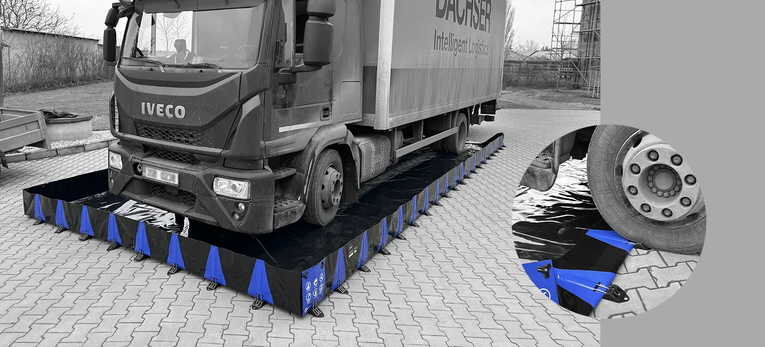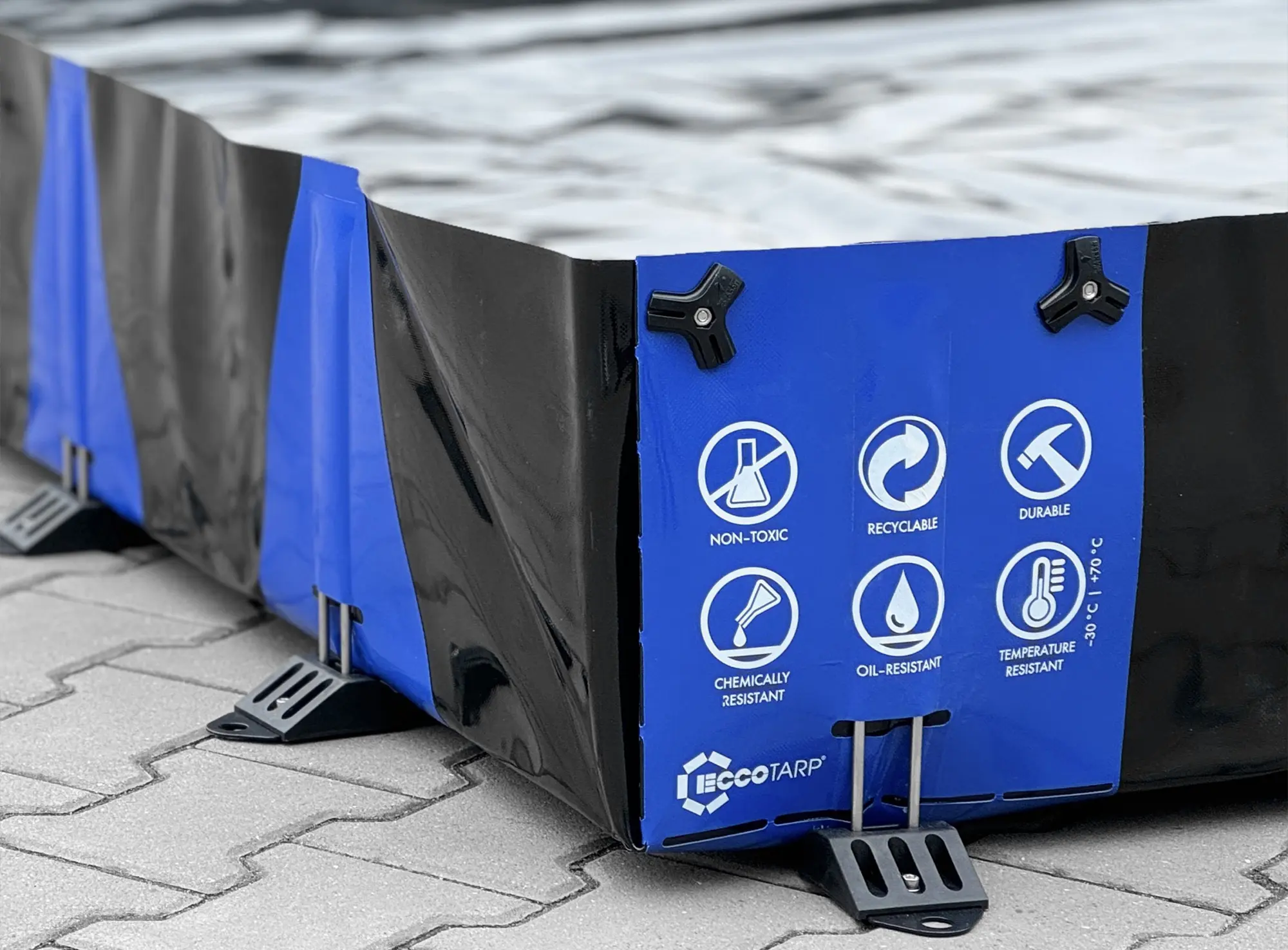 Portable folding drive-through spill containment berm made of highly mechanically resistant ReccoPro HardGuard material. Ideal for repeated entries, exits and for capturing emergency leaks, e.g. when pumping from tanks or cisterns, when washing or decontaminating vehicles, machines, construction equipment, etc.