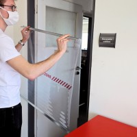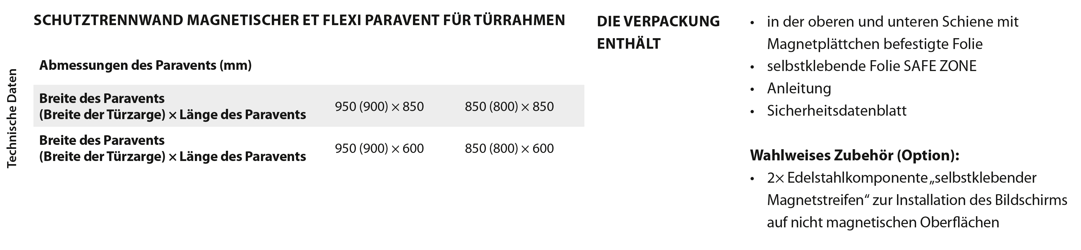 Der magnetische ET Flexi Paravent für Türrahmen besteht aus einer abwaschbaren, chemisch und UV-beständigen PVC-Klarsichtfolie (siehe Beständigkeitsliste), die an der oberen und unteren, verzinkten Schiene mit Magnetplättchen befestigt ist, welche wiederum die Folie schnell und einfach am eisernen Türrahmen ohne Notwendigkeit der festen Montage befestigen. Zugleich ermöglicht diese Art der Installation die operative und problemlose Höhenverstellung der Folienverankerung so, dass die Folie den Raum und die hinter der Folie befindlichen Personen wirksam schützt und dennoch den erforderlichen Kontakt z.B. bei der Übergabe von Dokumenten, Geld oder anderen Gegenständen möglich macht. Im Falle der erforderlichen Installation des Paravents in einer Blendenzarge oder auf anderen, nichtmagnetischen Flächen (Holz, Wand) liefern wir auf Wunsch die Edelstahlkomponente „magnetische Schiene“, die dank der speziellen, selbstklebenden Unterlage einfach und sicher auf einen jedweden, nichtmagnetischen Untergrund geklebt werden kann. Die Komponente ist darüber hinaus so konzipiert, dass sie am nichtmagnetischen Untergrund zusätzlich angeschraubt werden kann (die Schrauben sind nicht Bestandteil der Verpackung). Der Paravent kann anschließend auf dem so aufbereiteten Untergrund in üblicher Weise installiert werden. Standardbestandteil des Montagesets ist eine selbstklebende Folie mit der Aufschrift SAFE ZONE, die auf den im Türrahmen befindlichen Paravent hinweist. Der Kunde hat somit die Möglichkeit, selbst zu wählen, in welcher Höhe sich der Aufkleber befinden soll. Auf Wunsch des Kunden können die Schienen auch aus Edelstahl gefertigt werden. Magnetische Paravents für Türrahmen liefern wir in verschiedenen Abmessungen (siehe nachstehende Tabelle). Andere Abmessung des Paravents sind exakt nach Kundenwunsch lieferbar. Die Paravents sind für die Innen- und Außenanwendung geeignet. Die Paravents sollten regelmäßig mit geeigneten Desinfektionsmitteln desinfiziert werden. Der magnetische Paravent kann jederzeit demontiert, einfach durch Einrollen auf die Mindestabmessung zusammengelegt und für die weitere Verwendung aufbewahrt werden.